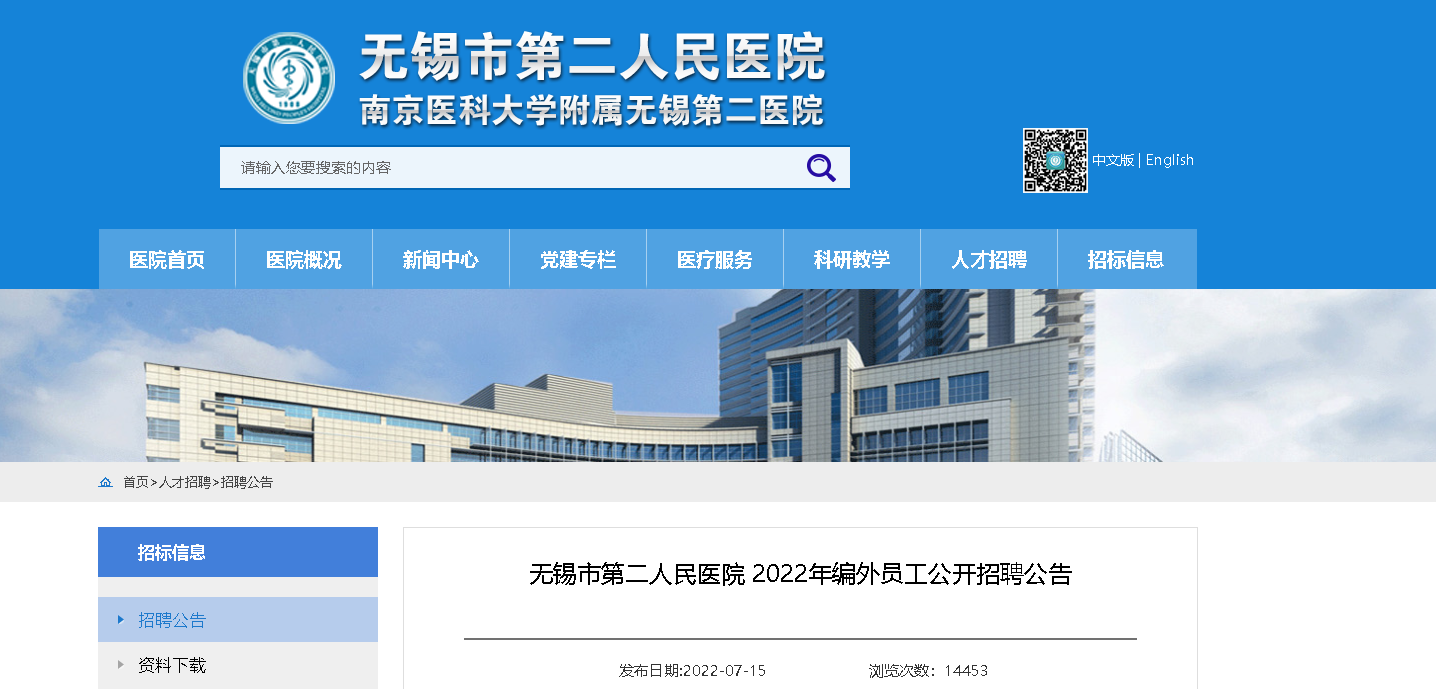2022年江蘇省無錫市第二人民醫(yī)院公開招聘編外員工135人,報(bào)名時(shí)間:2022年7月26日17:00截止,現(xiàn)將招聘公告原文發(fā)布如下: