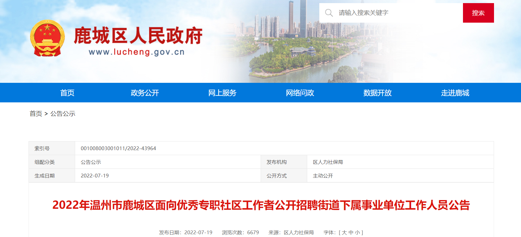 2022浙江省溫州市鹿城區(qū)面向優(yōu)秀專職社區(qū)工作者招聘街道下屬事業(yè)單位人員公告已發(fā)布。報(bào)名時(shí)間:2022年8月1日-8月2日(9:00-11:00,14:30-17:30)。現(xiàn)將招聘公告原文發(fā)布如下: