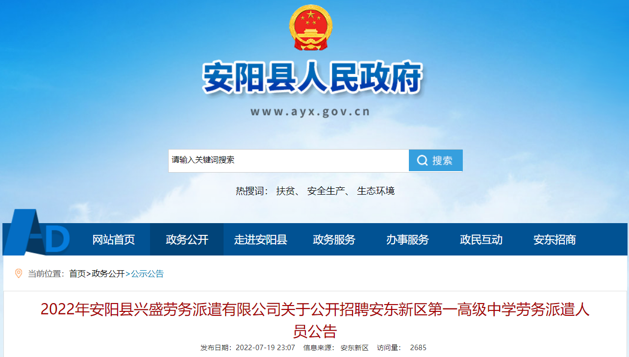 發(fā)布公告時(shí)間為2022年7月19日。在安陽(yáng)縣政府(安東新區(qū))網(wǎng)、安陽(yáng)縣公共就業(yè)微信公眾號(hào)上發(fā)布公告。