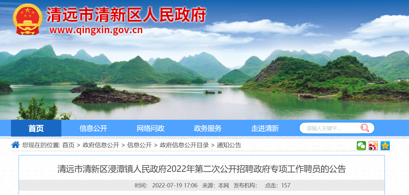 2022廣東省清遠市清新區(qū)浸潭鎮(zhèn)人民政府第二次招聘政府專項工作聘員公告已發(fā)布。報名時間:2022年7月19日-7月26日8:30—12:00;14:30—17:30(報名材料需在工作日提交)?,F(xiàn)將招聘公告原文發(fā)布如下: