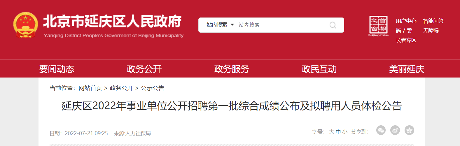 2022年北京市延慶區(qū)事業(yè)單位公開招聘第一批綜合成績(jī)公布及擬聘用人員體檢公告已發(fā)布。為您整理了以下內(nèi)容,供您參考。
