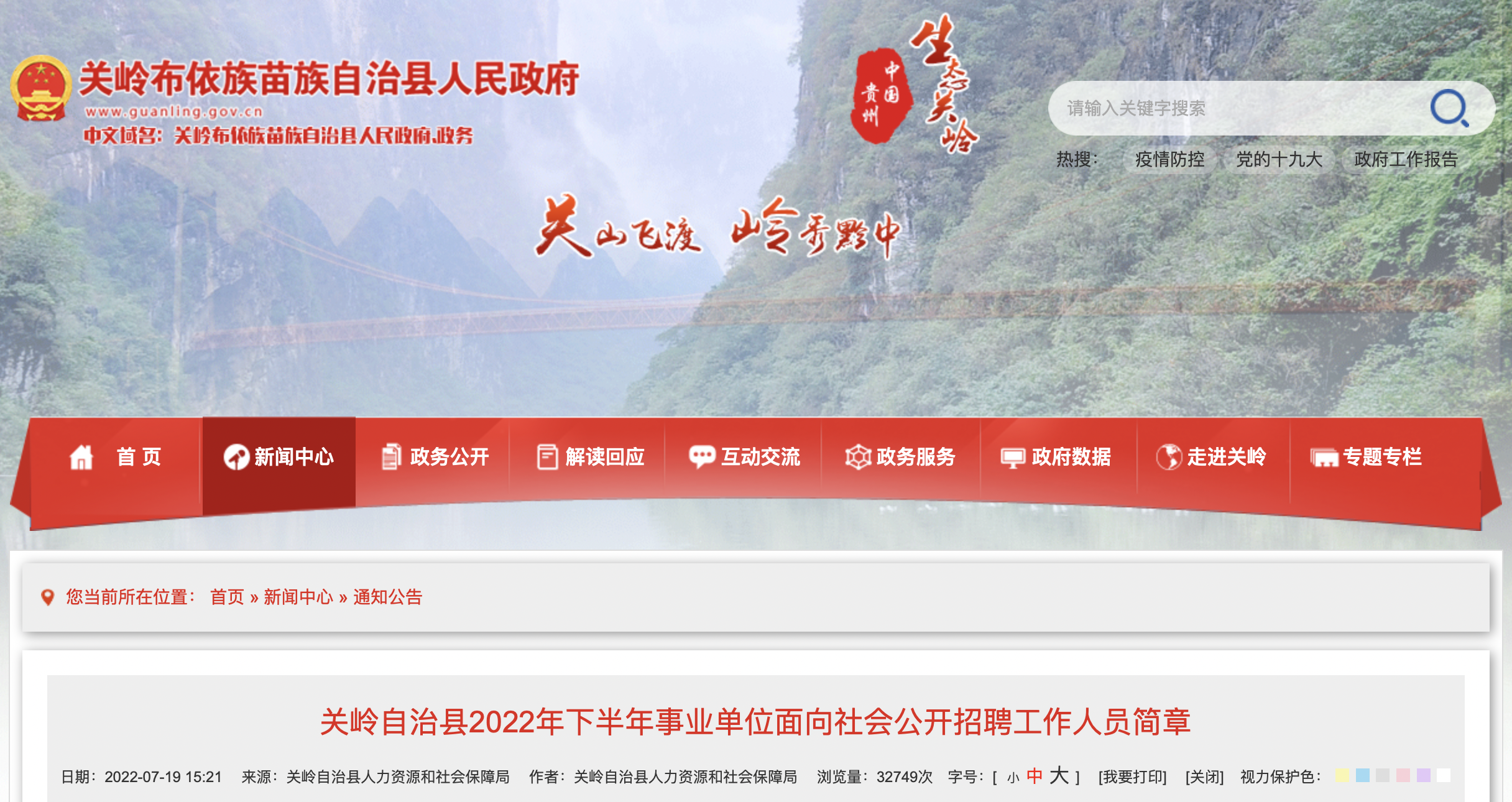 2022下半年貴州安順市關嶺自治縣事業(yè)單位工作人員招聘公告【170人】已發(fā)布,網絡報名時間為:2022年7月27日9:00至7月29日17:00,現將招聘公告原文發(fā)布如下: