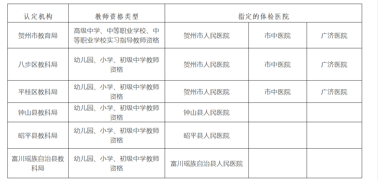 (七)按照《廣西壯族自治區(qū)申請認定教師資格人員體檢標準及辦法(試行)》,申請人須按各認定機構(gòu)規(guī)定流程到指定的醫(yī)院進行體檢。