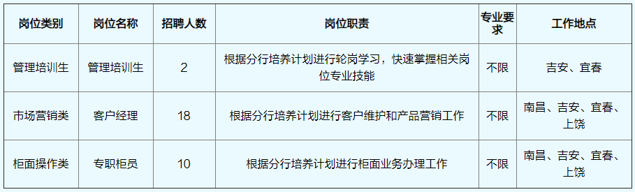 秋季校園招聘崗位分為管理培訓(xùn)生、市場(chǎng)營(yíng)銷類、柜面操作類共3大類崗位。崗位說(shuō)明如下: