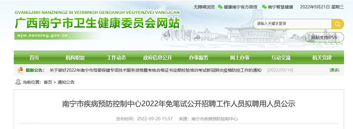 2022廣西南寧市疾病預(yù)防控制中心免筆試招聘工作人員擬聘用人員公示已出,公示時(shí)間:2022年9月20日-—9月26日,現(xiàn)將招聘公示原文發(fā)布如下: