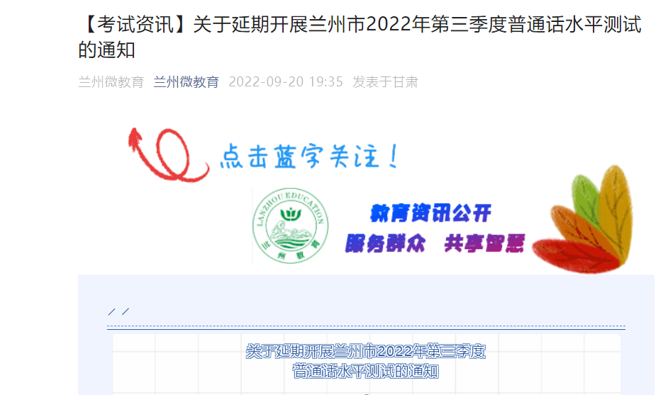 從蘭州微教育公眾號(hào)獲悉,關(guān)于延期開展甘肅蘭州2022年第三季度普通話水平測(cè)試的通知已公布,請(qǐng)相關(guān)人員仔細(xì)閱讀,具體詳情如下: