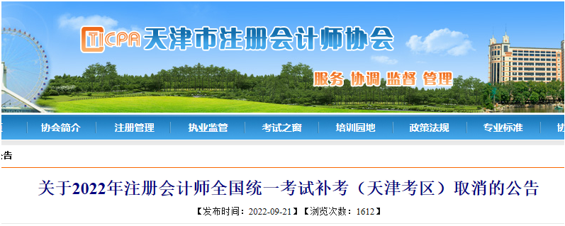 小編根據(jù)天津市注冊(cè)會(huì)計(jì)師協(xié)會(huì)發(fā)布“關(guān)于2022年注冊(cè)會(huì)計(jì)師全國(guó)統(tǒng)一考試補(bǔ)考(天津考區(qū))取消的公告”得知,原定于9月24日至25日舉辦的注冊(cè)會(huì)計(jì)師全國(guó)統(tǒng)一考試補(bǔ)考(天津考區(qū))取消,詳情如下: