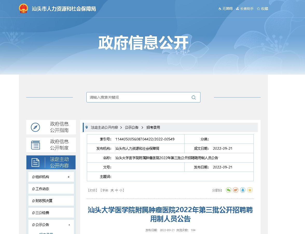 1.招聘公告在汕頭大學醫(yī)學院(http://www.med.stu.edu.cn/)、汕頭大學醫(yī)學院附屬腫瘤醫(yī)院網(wǎng)站(本院網(wǎng)址:https://sumcch.cn/)及汕頭市人力資源和社會保障局公開發(fā)布。