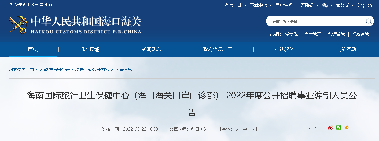 原標(biāo)題:海南國際旅行衛(wèi)生保健中心(??诤jP(guān)口岸門診部) 2022年度公開招聘事業(yè)編制人員公告