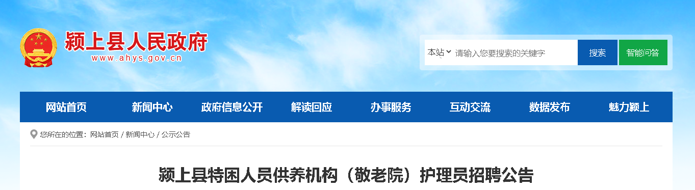 2022安徽阜陽(yáng)市潁上縣特困人員供養(yǎng)機(jī)構(gòu)(敬老院)護(hù)理員招聘40人,報(bào)名時(shí)間:2022年3月4日8:00--2022年3月11日17:30,額滿為止,現(xiàn)將招聘公告原文發(fā)布如下: