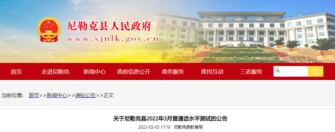 從尼勒克縣人民政府發(fā)布的《 2022年3月新疆伊犁州尼勒克縣普通話水平測試公告》得知,2022年3月新疆伊犁州尼勒克縣普通話考試時間、地點及要求已公布,考試時間為3月17日起,具體詳情如下:
