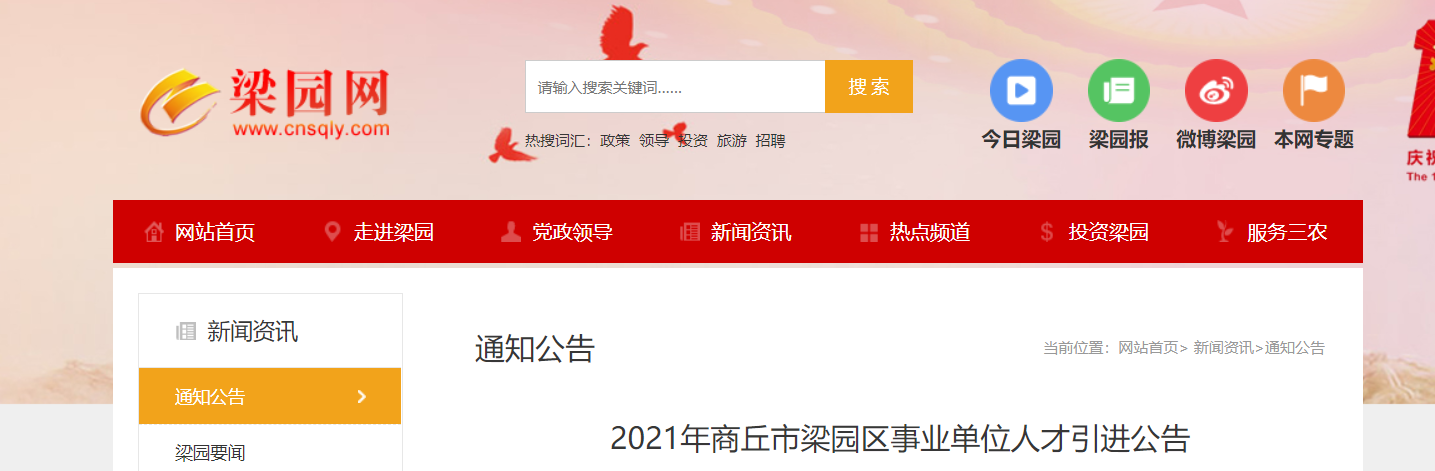 2021年12月29日至2022年1月4日,在“梁園網(wǎng)”(http://www.cnsqly.com)發(fā)布人才引進公告。