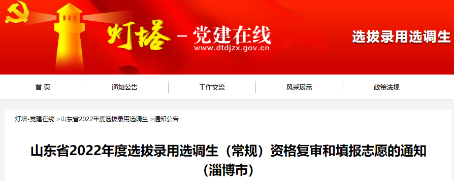 根據(jù)《山東省2022年度選拔錄用選調(diào)生公告》規(guī)定,現(xiàn)將淄博市2022年度選拔錄用選調(diào)生(常規(guī))資格復(fù)審和填報志愿工作有關(guān)事宜通知如下: