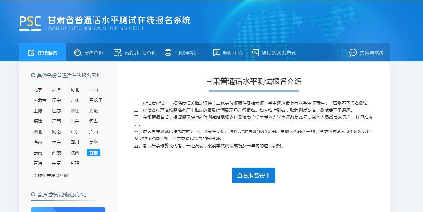 報(bào)考人員按照指定報(bào)名時(shí)間登錄“甘肅省普通話水平測試在線報(bào)名系統(tǒng)”(http://gsbm.cltt.org/pscweb/index.html),選擇“蘭州市語言文字培訓(xùn)測試站”,自主選擇測試日期進(jìn)行網(wǎng)上報(bào)名,上傳的照片用于打印準(zhǔn)考證,照片須為小于1M、JPG格式的近期免冠證件照。