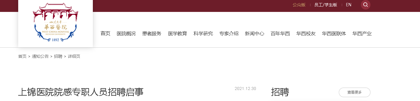 2021上錦醫(yī)院院感專(zhuān)職人員招聘2人,報(bào)名時(shí)間:2022年1月5日截止,現(xiàn)將招聘公告原文發(fā)布如下: