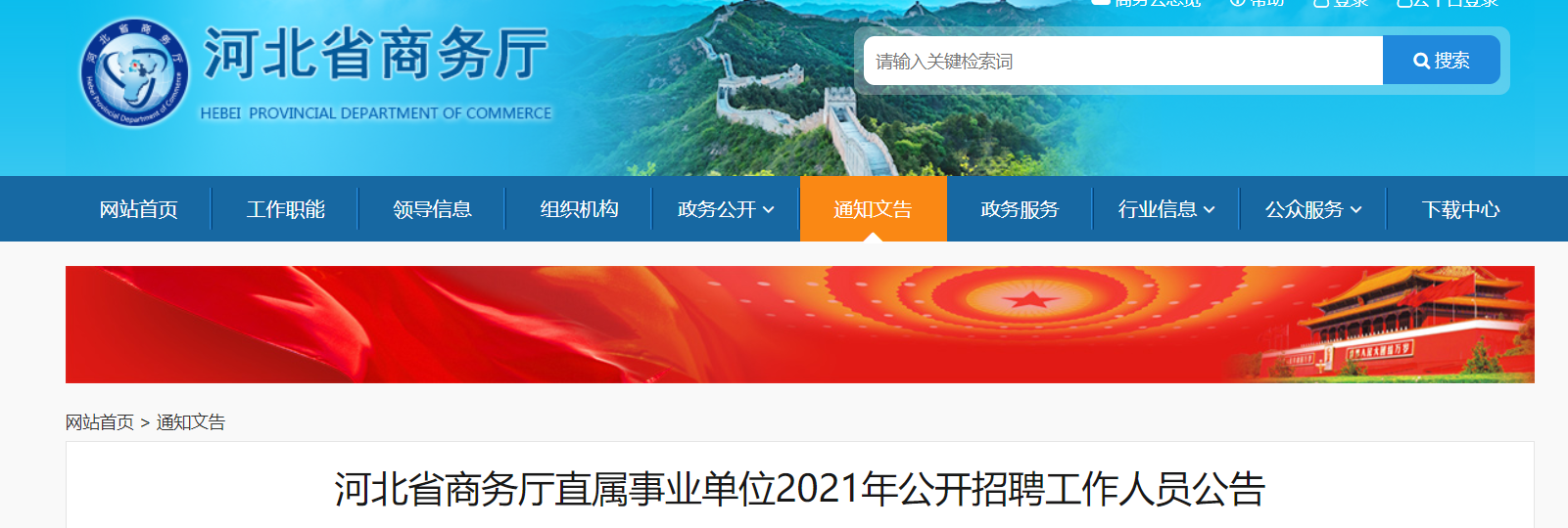 通過河北人社網(wǎng)(http://rst.hebei.gov.cn/)、河北省商務(wù)廳網(wǎng)站(http://swt.hebei.gov.cn/)面向社會公開發(fā)布招聘信息。