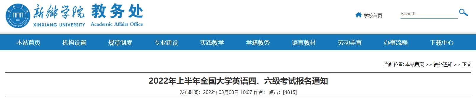 從新鄉(xiāng)學(xué)院教務(wù)處獲悉,2022年上半年河南新鄉(xiāng)學(xué)院全國(guó)大學(xué)英語(yǔ)四、六級(jí)考試報(bào)名通知已公布,報(bào)名時(shí)間為3月25日-4月8日,具體詳情如下: