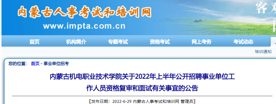 2022上半年內(nèi)蒙古機電職業(yè)技術(shù)學(xué)院招聘資格復(fù)審和面試有關(guān)事宜公告已發(fā)布,現(xiàn)將原文發(fā)布如下: