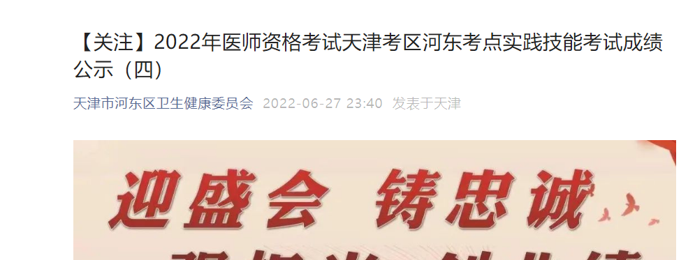 從天津河?xùn)|衛(wèi)生健康委員會(huì)公眾號(hào)獲悉,2022年天津河?xùn)|醫(yī)師資格實(shí)踐技能考試成績已公布,請(qǐng)相關(guān)人員仔細(xì)閱讀,具體詳情如下: