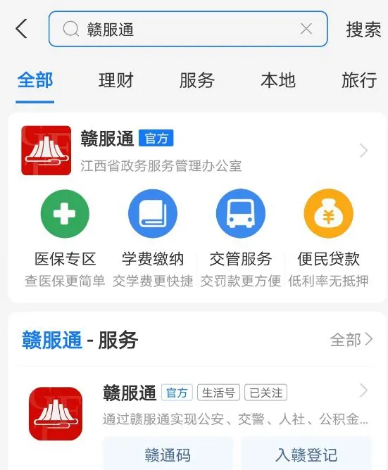 1.支付寶搜索“贛服通”或應(yīng)用市場下載“贛服通”APP進(jìn)入平臺。