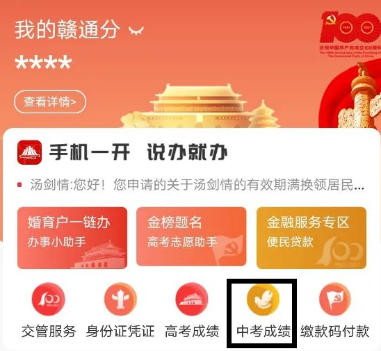 打開手機(jī)支付寶贛服通,輸入“中考成績查詢”,選擇“吉安市”,輸入報(bào)名序號即可查詢。