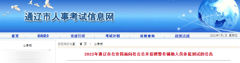 根據(jù)《2022年通遼市公安局面向社會公開招聘警務輔助人員簡章》的有關要求,現(xiàn)將2022年通遼市公安局面向社會公開招聘警務輔助人員體能測試有關事項公告如下: