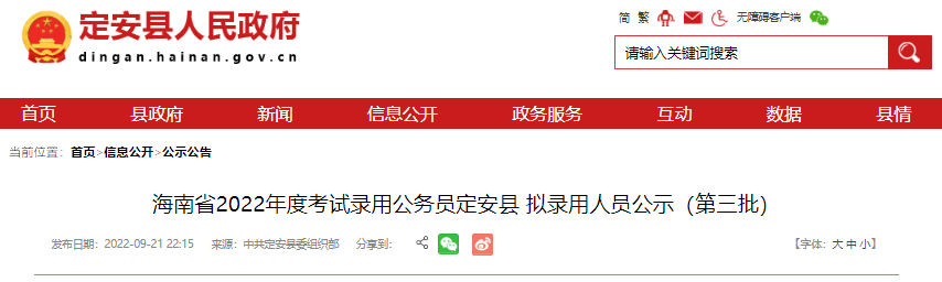 2022年海南省定安縣考試錄用公務(wù)員擬錄用人員公示(第三批)已公布,為了方便廣大考生的查閱,下面為您詳細(xì)介紹一下本次擬錄用人員公示的具體事宜,希望廣大考生及時(shí)關(guān)注,如有相關(guān)疑問,請(qǐng)關(guān)注公務(wù)員頻道為您實(shí)時(shí)做出的更新。