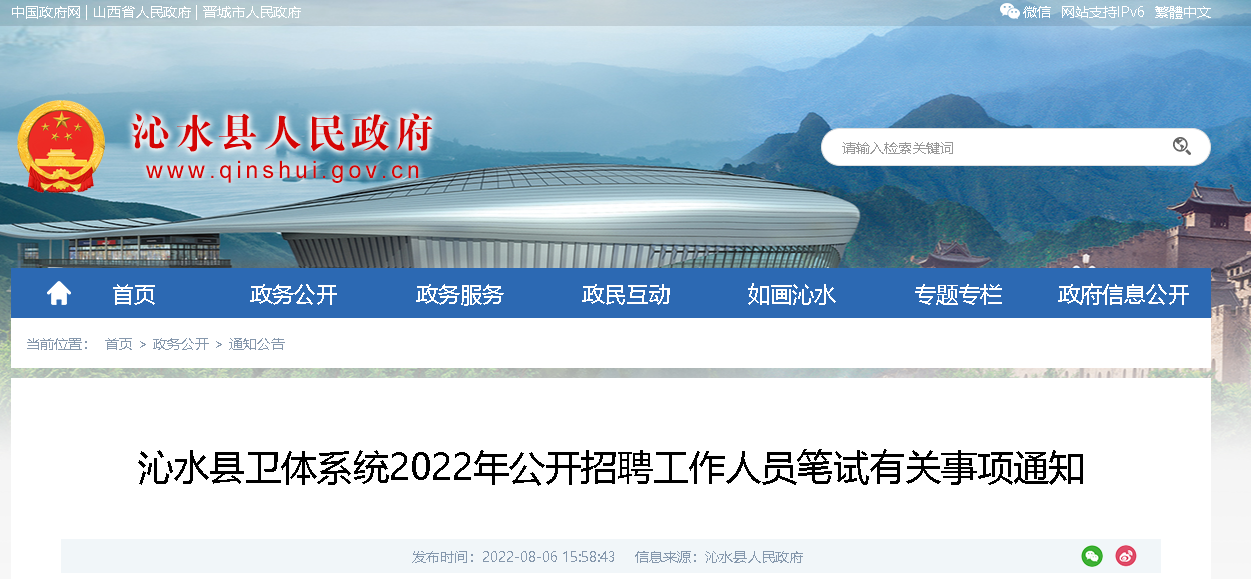 2022山西晉城市沁水縣衛(wèi)體系統(tǒng)招聘筆試有關(guān)事項(xiàng)通知已出,筆試時(shí)間:2022年8月13日上午9:00--11:00,現(xiàn)將招聘通知原文發(fā)布如下: