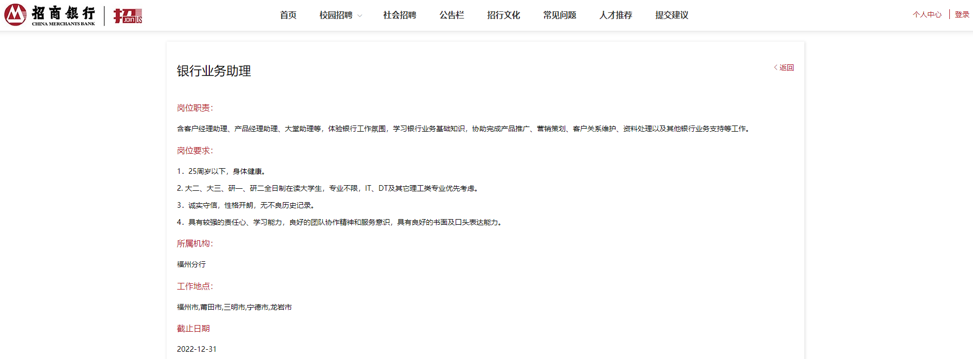 2022招商銀行福建福州分行銀行業(yè)務(wù)助理實習(xí)生招聘若干人,截止時間:2022年12月31日,現(xiàn)將招聘詳情發(fā)布如下: