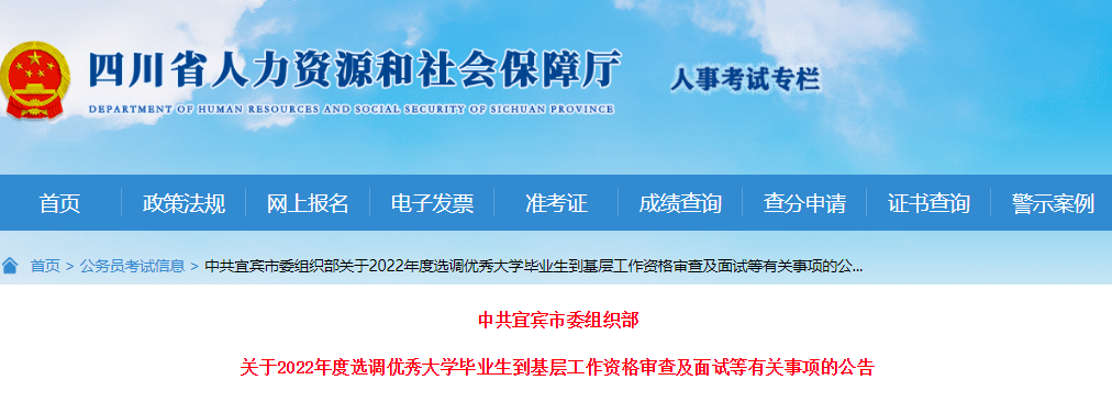 根據(jù)《四川省2022年度選調(diào)優(yōu)秀大學(xué)畢業(yè)生到基層工作公告》規(guī)定,現(xiàn)將宜賓市2022年度選調(diào)生資格審查及面試等有關(guān)事項(xiàng)公告如下: