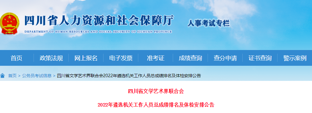 根據(jù)《四川省文學(xué)藝術(shù)界聯(lián)合2022年面向全省公開遴選機(jī)關(guān)工作人員公告》的規(guī)定,現(xiàn)將我單位此次公開遴選工作人員參加面試考生的總成績(jī)排名、體檢人員名單及體檢安排的有關(guān)事項(xiàng)公告如下。