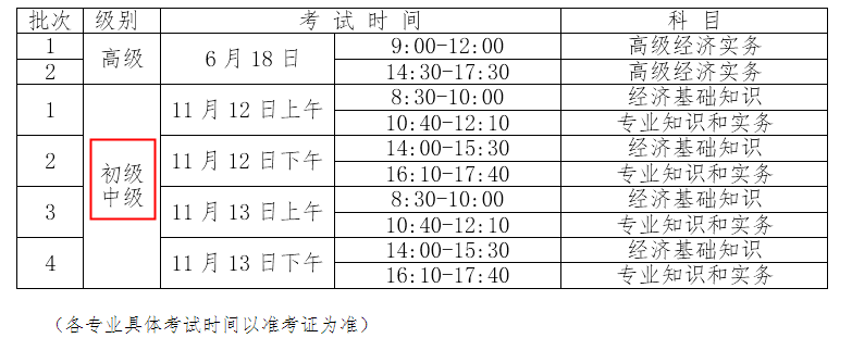 初、中級(jí)考試分2天,上、下午共4個(gè)批次實(shí)施(附件1)。各級(jí)別及專(zhuān)業(yè)類(lèi)別的具體批次劃分和考試時(shí)間,視報(bào)名情況另行確定。