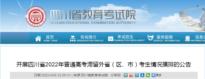 從四川省教育考試院了解到,開展四川省2022年普通高考滯留外?。▍^(qū)、市)考生情況摸排的公告已發(fā)布,詳細(xì)內(nèi)容如下: