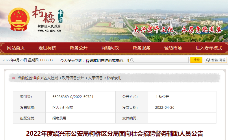 因公安工作需要,經(jīng)研究決定,現(xiàn)委托紹興市柯橋區(qū)人力資源和社會(huì)保障局面向社會(huì)公開(kāi)招聘警務(wù)輔助人員135名。有關(guān)事項(xiàng)公告如下: