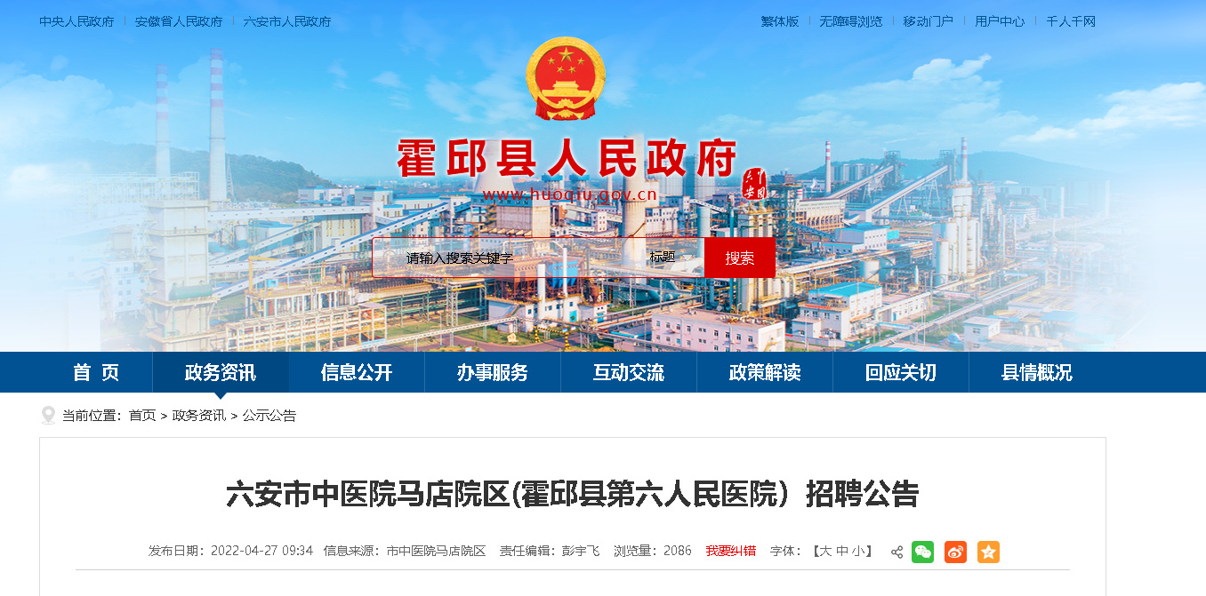 體檢合格的擬聘用人員名單,在霍邱縣第六人民醫(yī)院(六安市中醫(yī)院馬店院區(qū))網(wǎng)站公示5天。
