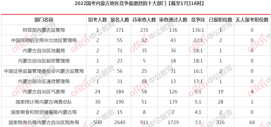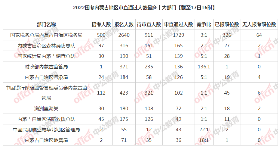 為幫助廣大考生更清晰的了解今日報名情況,整理了2022國考內蒙古地區(qū)審核通過人數(shù)前十位的部門以及競爭比例最激烈的十大部門,供廣大考生參考: