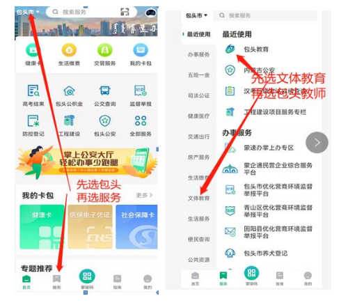 蒙速辦”APP操作方法:手機(jī)下載注冊(cè)“蒙速辦”APP→左上角選“包頭”→左下角“服務(wù)”→點(diǎn)擊左側(cè)“文體教育”→選“包頭教育”→點(diǎn)擊上方“市教育局人才引進(jìn)報(bào)名”。