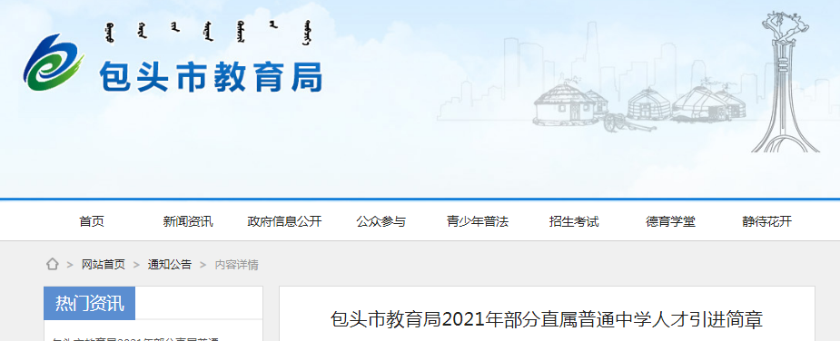 2021年內(nèi)蒙古包頭市教育局部分直屬普通中學(xué)人才引進(jìn)簡(jiǎn)章已發(fā)布,報(bào)名時(shí)間:10月18日9:00-10月21日18:00。現(xiàn)將招聘公告原文發(fā)布如下: