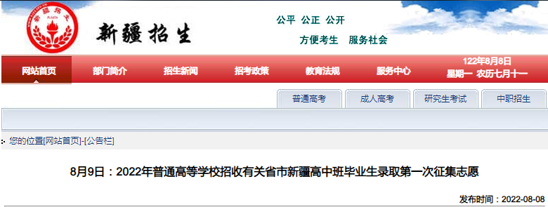 從新疆招生網(wǎng)了解到,2022年8月9日普通高等學(xué)校招收有關(guān)省市新疆高中班畢業(yè)生錄取第一次征集志愿,詳細(xì)內(nèi)容如下: