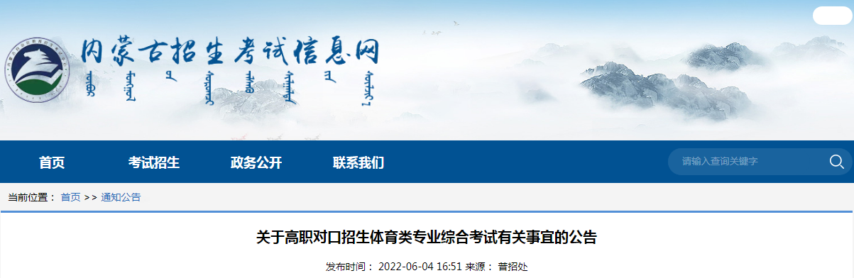 體育高考頻道從內(nèi)蒙古招生考試信息網(wǎng)了解到,2022年內(nèi)蒙古高職對口招生體育類專業(yè)綜合考試有關事宜的公告已發(fā)布,詳情如下: