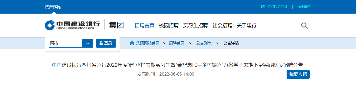 2022年度建設銀行四川分行“建習生”暑期實習生招聘若干人,報名時間:2022年6月30日24點截止,現(xiàn)將招聘公告發(fā)布如下: