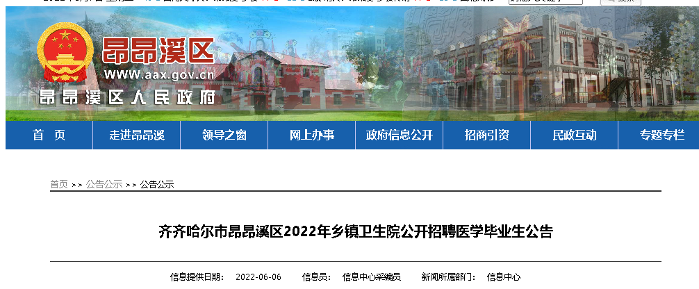 根據(jù)《關(guān)于印發(fā)黑龍江省鄉(xiāng)鎮(zhèn)衛(wèi)生院2022年公開招聘醫(yī)學畢業(yè)生實施辦法的通知》(黑衛(wèi)基層函〔2022〕22號)文件精神及省深化醫(yī)藥衛(wèi)生體制改革領(lǐng)導小組會議關(guān)于建立鄉(xiāng)鎮(zhèn)衛(wèi)生院大學生動態(tài)補充機制的要求,昂昂溪區(qū)鄉(xiāng)鎮(zhèn)衛(wèi)生院面向社會公開招聘醫(yī)學畢業(yè)生,現(xiàn)將有關(guān)事宜公告如下: