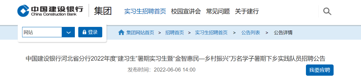 2022年度中國建設(shè)銀行河北省分行“建習(xí)生”暑期實習(xí)生招聘公告已發(fā)布。報名截止時間為2022年6月30日24點(北京時間)。現(xiàn)將招聘公告原文發(fā)布如下: