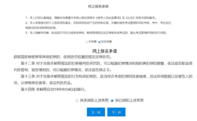閱讀網(wǎng)上報名承諾以及中華人民共和國刑法條例,選擇完全同意和我已閱知上述條款,然后點(diǎn)擊"下一步"。