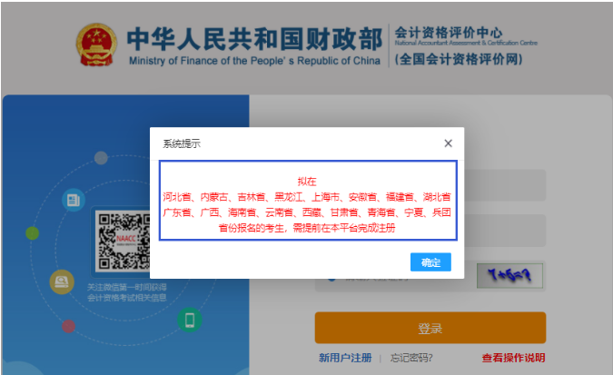 一、考生通過點(diǎn)擊全國會計資格評價網(wǎng)(http://kzp.mof.gov.cn/)右上方的登錄鏈接,進(jìn)入登錄頁面,根據(jù)提示輸入用戶名、密碼以及驗證碼,點(diǎn)擊"登錄"按鈕進(jìn)入系統(tǒng)首頁。也可使用本人微信掃碼登錄,如下圖所示。