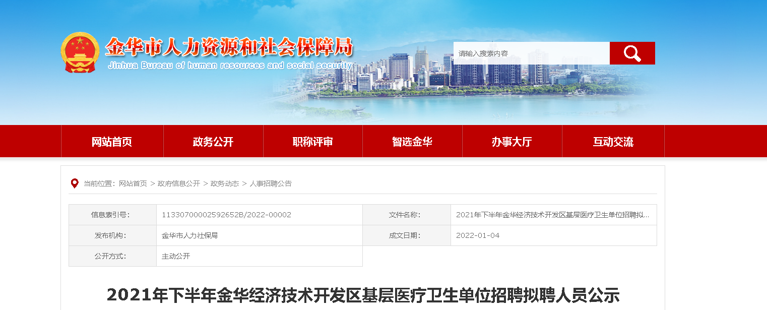 2021下半年浙江金華經(jīng)濟技術開發(fā)區(qū)基層醫(yī)療衛(wèi)生單位招聘擬聘人員公示已出,公示時間:從2022年1月5日到1月13日(七個工作日),現(xiàn)將招聘公示原文發(fā)布如下: