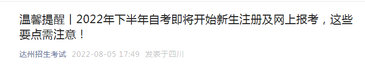 自考頻道從達州招生考試發(fā)布的《2022年下半年四川自考新生注冊及網(wǎng)上報考溫馨提醒》了解到,2022年下半年四川成都自考新生注冊時間為8月8日-8月11日,詳情如下: