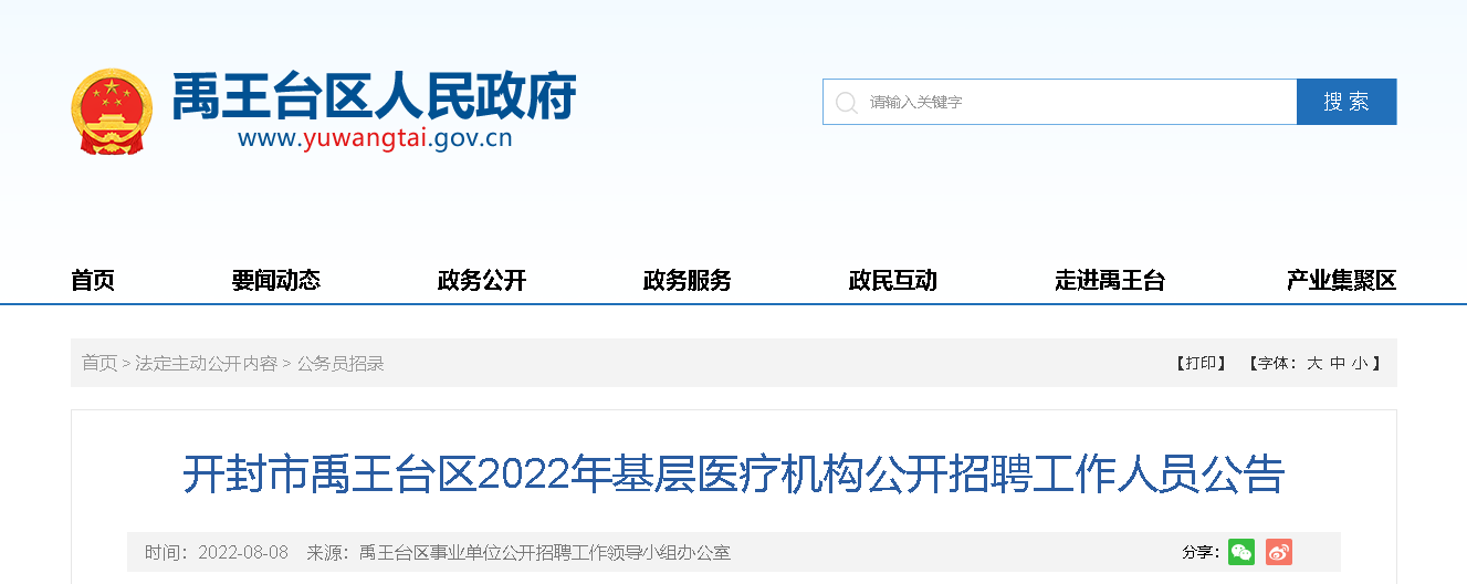 2022年河南開封市禹王臺(tái)區(qū)基層醫(yī)療機(jī)構(gòu)公開招聘工作人員5人,報(bào)名時(shí)間:2022年8月17日9:00至8月19日17:00,現(xiàn)將招聘公告原文發(fā)布如下: