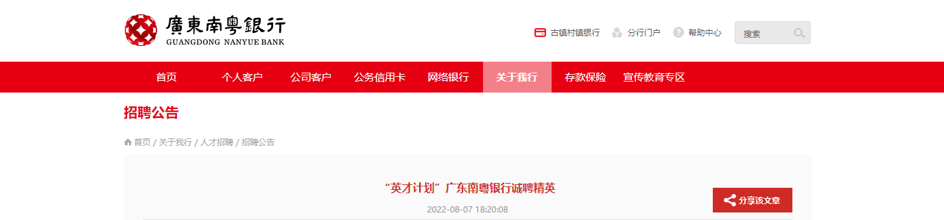 因業(yè)務發(fā)展需要,廣東南粵銀行股份有限公司全國誠聘英才,期待您的加入。