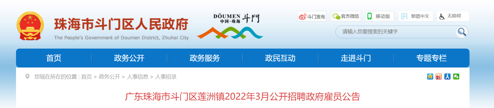 2022年廣東省珠海市斗門區(qū)蓮洲鎮(zhèn)招聘政府雇員公告已發(fā)布?,F(xiàn)場報(bào)名時(shí)間為2022年3月11日—2022年3月18日(周一至周五,上午9:00—12:00,下午14:00—18:00)。報(bào)名地點(diǎn)在珠海市斗門區(qū)蓮洲鎮(zhèn)組織辦(蓮洲鎮(zhèn)政府1號樓3樓)。聯(lián)系人:陳先生,聯(lián)系電話:0756—2788187。為您整理了招聘條件和報(bào)名流程,供您參考。